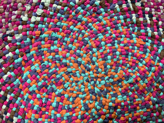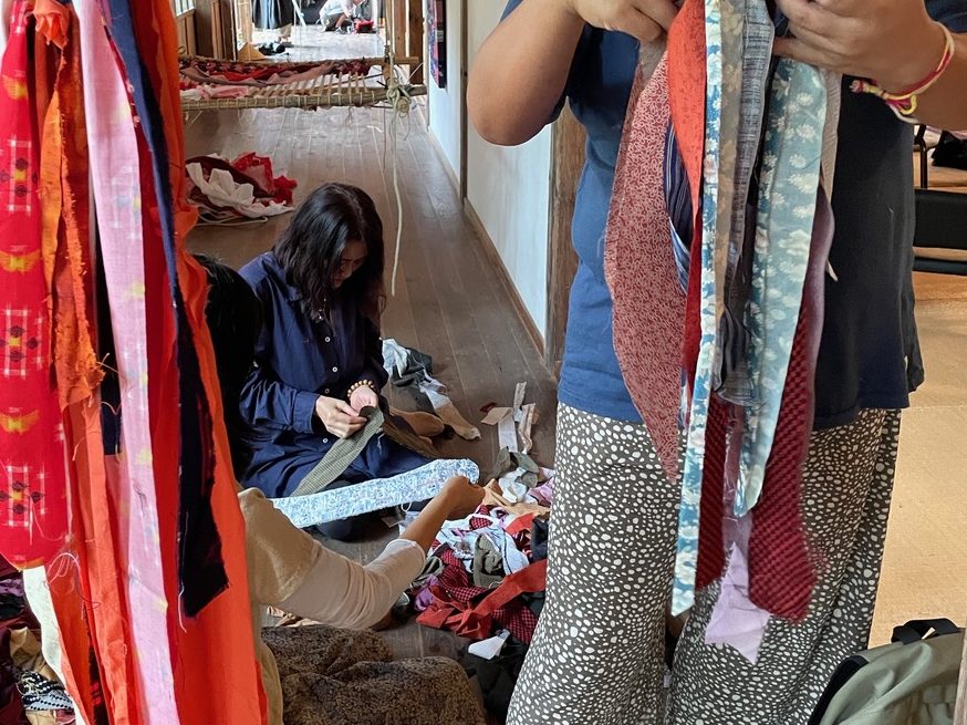 Aus textilen Resten und Altkleidern flicht die Künstlerin Doro Seror mit den Besucherinnen überdimensionale Freundschaftsbänder.